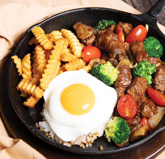철판 속 맛있게 구운 큐브 스테이크와 감자튀김, 그리고 밥까지!